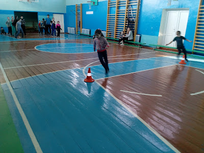 - участник оббегает стойки ведя ногой волейбольный мяч, дойдя до баскетбольного кольца, забрасывает мяч в кольцо и возвращается, обводя стойки, передавая эстафету следующему участнику. Побеждает команда, которая первая справиться с этим заданием.