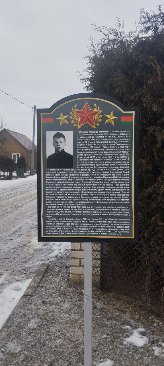 Александр Матвеевич Матросов (1924-1943 гг.) родился в Украине в г. Днепропетровске. В Красной Армии с 1943 года. Воевал на Калининском фронте. 23 февраля 1943 года в бою за д. Чернушки, что в Псковской области, рядовой Матросов своим телом закрыл амбразуру немецкого дзота, обеспечив успех атаки подразделения. За совершенный героический подвиг ему было присвоено звание Героя Советского Союза.