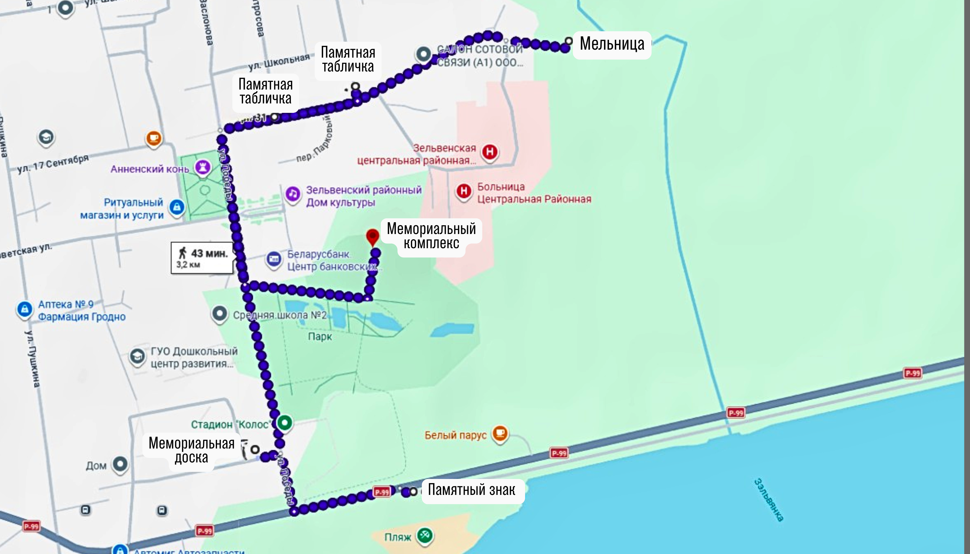Нитка маршрута: памятный знак «Дорога памяти «Зельвенский прорыв» – мемориальная доска, посвященная Герою Советского Союза П.И. Жданову –– водяная мельница конца XIX в. – памятная табличка «Их именами названы улицы Зельвы». Улица Булака – памятная табличка «Их именами названы улицы Зельвы». Улица Матросова – Мемориальный комплекс Боевой Славы в г.п. Зельва «Солдат. Мать. Партизан.», посвященный памяти погибших воинов Красной Армии и жертв фашизма во время Великой Отечественной войны 1941-1945 гг.